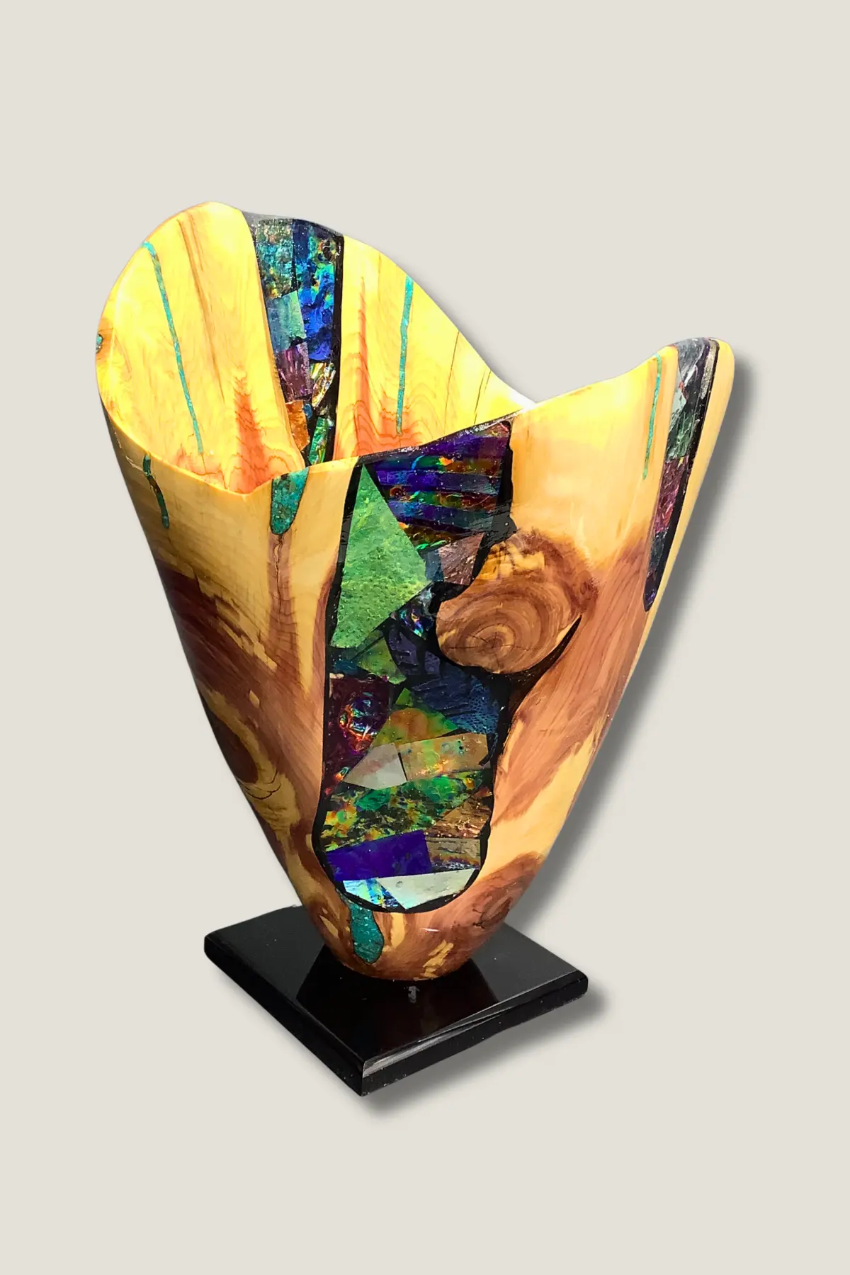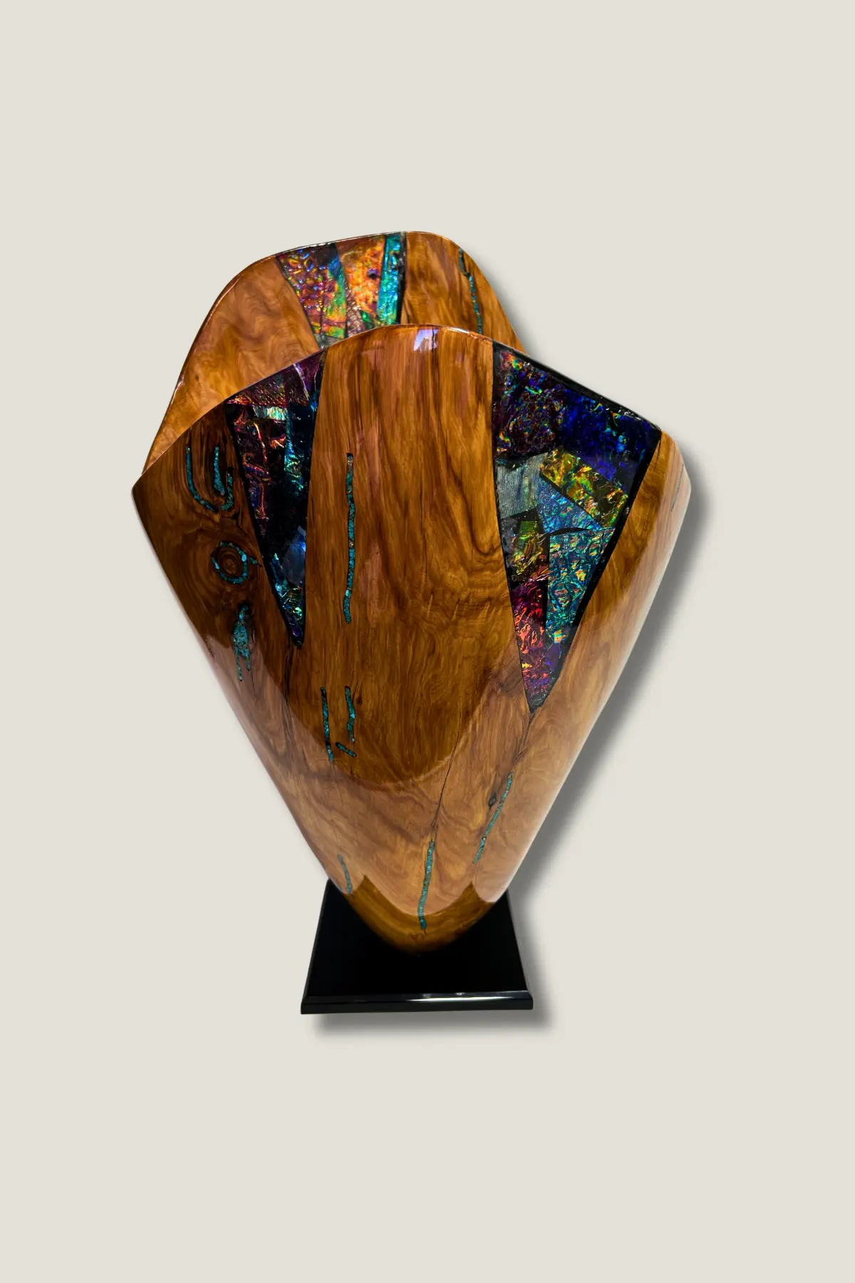 Imagine the raw beauty of salvaged logs and burls, each one chosen for the story it tells — transformed through chainsaw, grinder, and years of self-taught mastery into sculptures that evoke fluidity, movement, and wonder. Delicate waves, intricate folds, tunnels, and ribbons emerge from the wood, brought to life with dichroic glass inlays, patina techniques, and textured surfaces that shimmer and shift with the light.